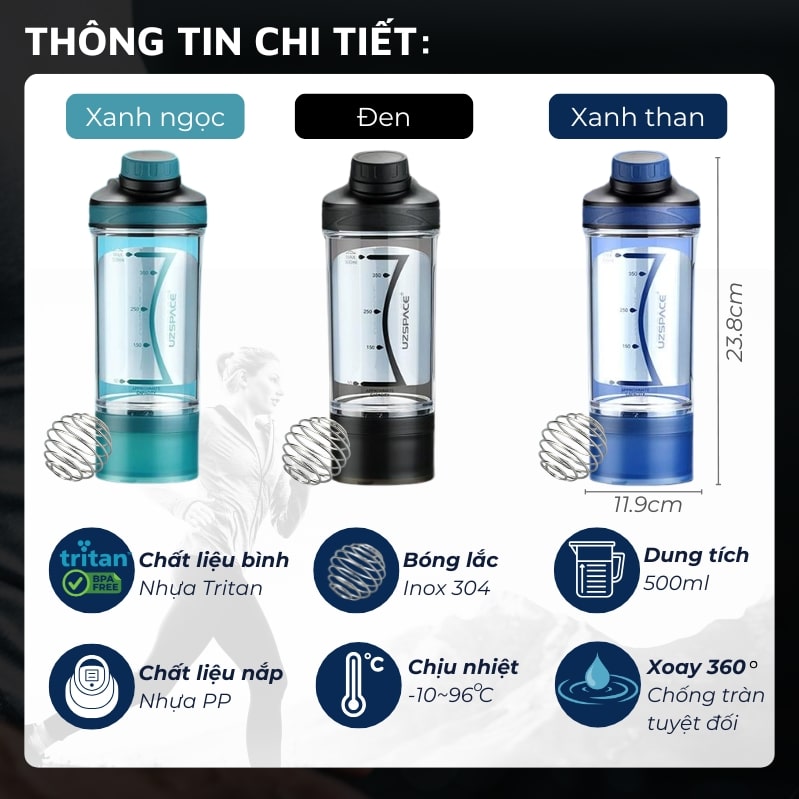 - Nhựa Tritan cao cấp, trong suốt, độ bền cao: không chứa BPA, an toàn tuyệt đối cho sức khỏe của bạn và gia đình.