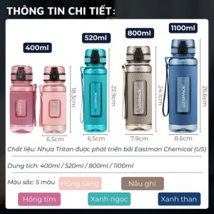 - 4 size, 5 màu sắc: lựa chọn đa dạng phù hợp theo nhu cầu. Từ trẻ em (400ml) đến người lớn (520-800ml) hoặc lưu trữ nước (1100ml).