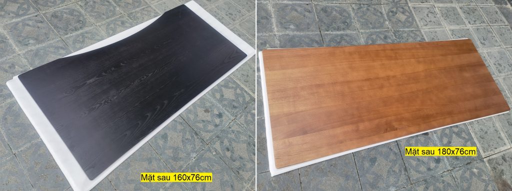 Mặt số 3. Mặt bàn ghép thanh có gia cố thanh chống cong vênh: cũng làm ở xưởng khác ở Thạch Thất – Hà Nội. Xưởng này cũng không bảo hành, phần lớn mặt bàn vẫn bị cong vênh (nhẹ) sau một thời gian sử dụng.