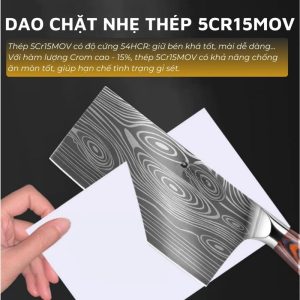 Dao chặt nhẹ cao cấp DandiHome được làm từ thép 5Cr15MOV hoặc VG10, đều có khả năng chịu mài mòn tốt và có độ bền cao. Điều này giúp dao có khả năng cắt sắc bén và đảm bảo độ bền lâu dài.