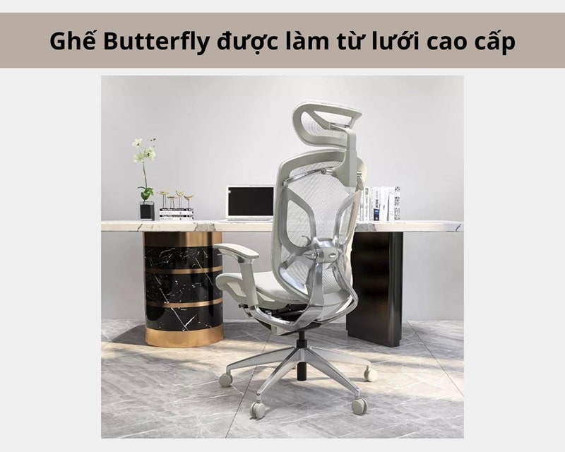 Ghế công thái học butterfly được làm từ lưới cao cấp hoặc chất liệu đệm thoáng khí giúp hạn chế tình trạng hầm lưng, đặc biệt trong thời tiết nóng bức. Ngoài ra, khung ghế chắc chắn từ kim loại hoặc nhựa cao cấp giúp ghế có tuổi thọ lâu dài.