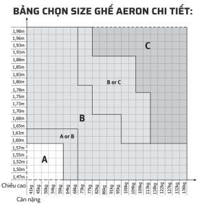 Ghế công thái học Herman Miller Aeron được chia làm ba kích thước khác nhau. Với cỡ A (size nhỏ) – B (size vừa) – C (size lớn). Trong đó, size B được thiết kế dành cho 90% dân số thế giới.