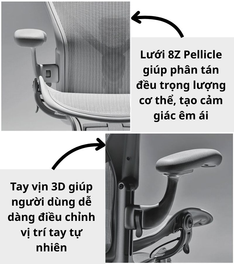 Cấu trúc lưới và tay vịn của ghế Herman Miller Aeron- Tay vịn điều chỉnh 3 chiều: chắc chắn và êm ái, có nâng hạ độ cao. Thiết kế này giúp người dùng dễ dàng điều chỉnh vị trí tay tự nhiên, giảm căng thẳng cho vai và cổ tay khi làm việc lâu dài. Bề mặt tay vịn êm ái, hỗ trợ tối đa trong mọi tư thế.