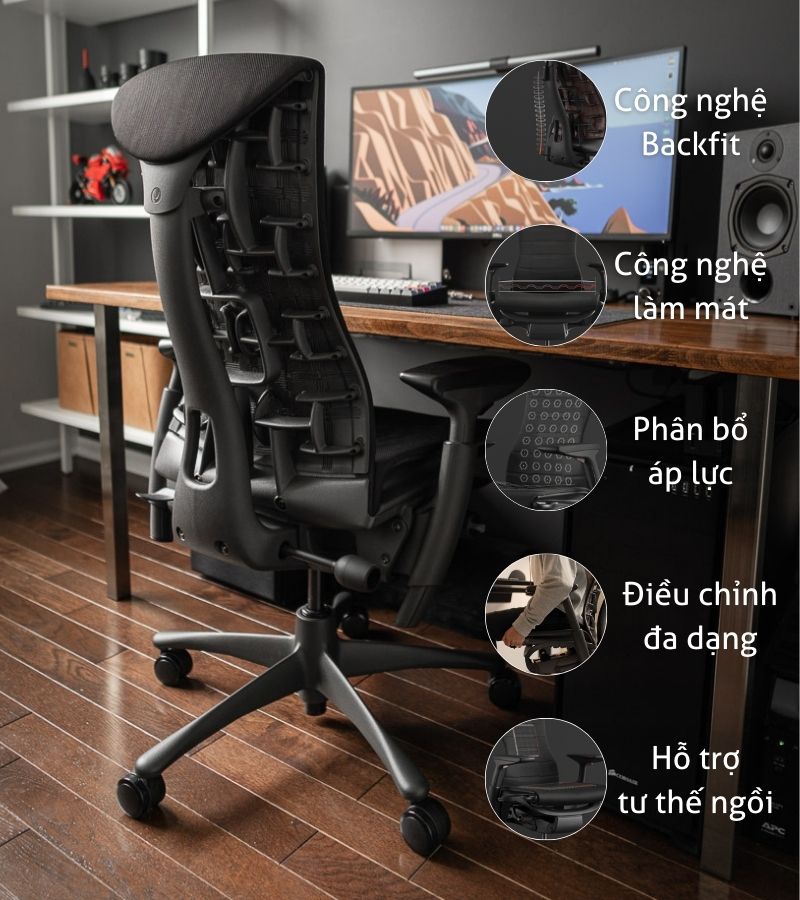- Công nghệ Backfit: Đây là điểm nổi bật của ghế Embody, giúp phần lưng ghế tự động điều chỉnh theo hình dáng và chuyển động cột sống của người dùng, tạo sự hỗ trợ chính xác cho từng vùng lưng, giảm áp lực và ngăn ngừa mỏi mệt khi ngồi lâu.