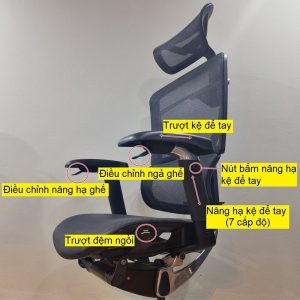 - Cơ chế điều khiển ngả ghế và nâng hạ ghế đặt ở phần để tay. Người dùng hoàn toàn ko cần cúi xuống gầm ghế điểu chỉnh như các mẫu ghế truyền thống.