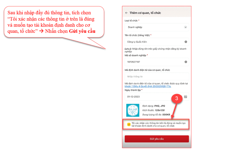 – Người đại diện theo pháp luật, người đứng đầu cơ quan, tổ chức, hoặc người được người đại diện theo pháp luật, người đứng đầu ủy quyền sử dụng tài khoản định danh điện tử mức độ 02 của mình đăng nhập Ứng dụng định danh quốc gia, cung cấp các thông tin theo hướng dẫn và gửi yêu cầu đề nghị cấp tài khoản định danh điện tử cho cơ quan, tổ chức sau khi được sự đồng ý của toàn bộ người đại diện theo pháp luật khác của tổ chức (nếu có).